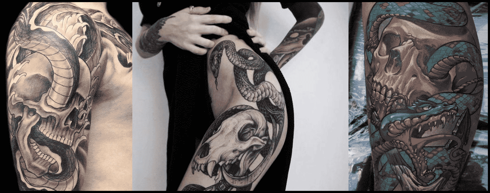 Le tatouage de crâne de serpent ou de serpent est conçu avec un symbole de serpent et relève généralement d'un type de symbolisme et d'art plus gothique. Ce tatouage symbolise la mort, tandis que le serpent symbolise le secret et la connaissance. Lorsqu'ils se rejoignent, le tatouage dans son ensemble représente la persistance de la connaissance après la mort.