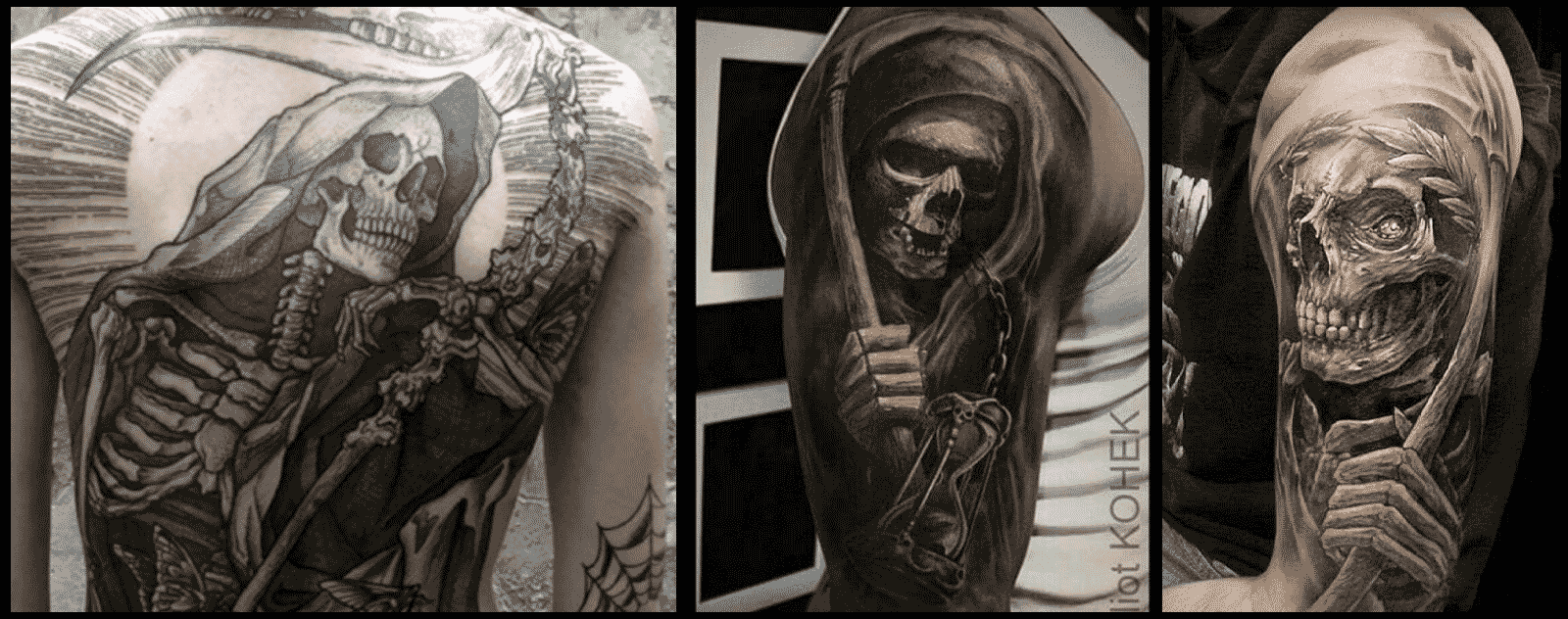 Bien que le tatouage de la faucheuse soit une représentation courante de la mort, ce tatouage symbolise en fait le cercle de la vie et peut représenter le courage et la bonne fortune. Il est parfois accompagné de mots tels que "craignez la faucheuse", "pas de crainte", "la mort vient pour nous tous" et d'autres citations.